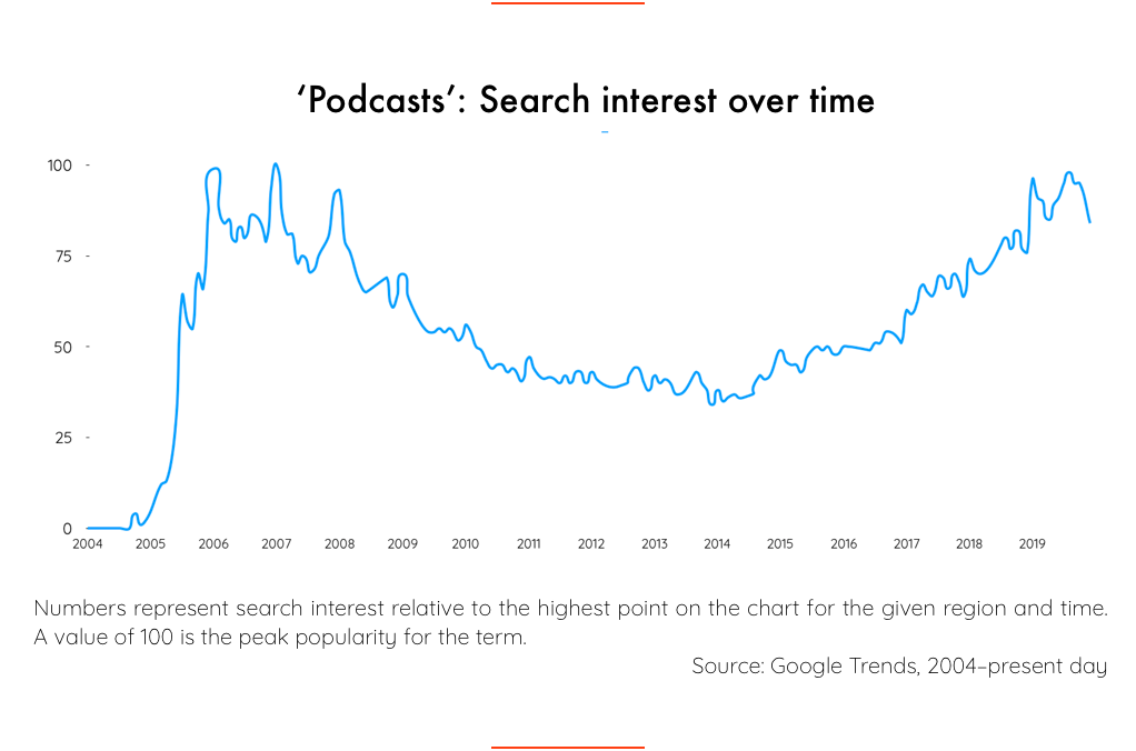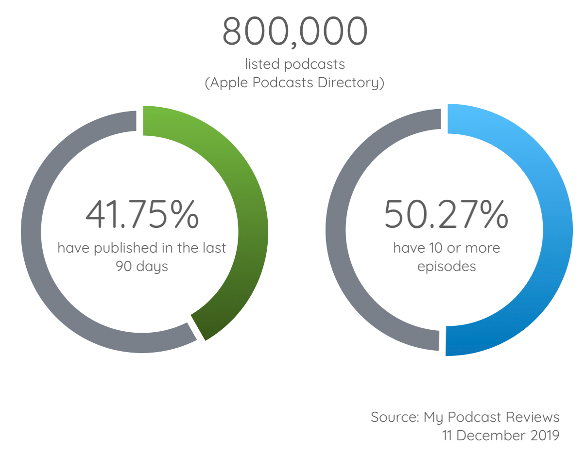 2019 was a monumental year in many ways for the industry with acquisitions, reshuffles and various new launches. The number of shows listed in Apple Podcasts’ directory crossed 800,000 in December, of which about 41% are considered active. Spotify planted its roots firmly in the space with the acquisition of content studio Gimlet Media and technology platform Anchor in May, while also announcing their plans to spend an additional US$500 million in podcast-related acquisitions. Both Apple and Google introduced new features for their native podcast applications, including the ability to search by text through episode audio.