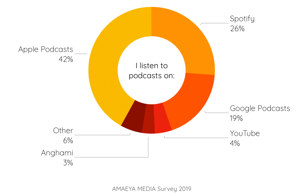 The UAE in particular is an expat-heavy country and many listeners are more connected with shows from home. Many have Apple IDs registered in their home countries, which affects the browsing tab in Apple Podcasts, the dominant podcast player (42%). Non-Apple podcast listeners tend to tune in via Spotify (26%) or Google Podcasts (19%) and are also usually directed to globally trending shows or work with algorithms that tend to suggest ‘similar’ shows to those already selected, compounding the problem.